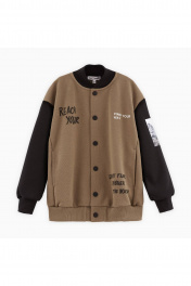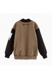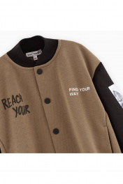 Жакет-бомбер тёплого оттенка карамельный песок с контрастными рукавами для мальчика. Прямая объёмная модель. Воротник-стойка, низ изделия и манжеты из рибаны. Карманы в шве. Комфортная застёжка на кнопки. Бомбер декорирован авторскими принтами.