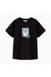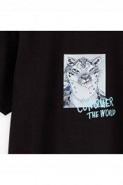 Чёрная футболка для мальчика. Модель прямого силуэта с приспущенной линией плеча. Эластичная горловина из рибаны. Футболка декорирована авторским принтом и фразой. Комбинация печатей – устойчивая к стиркам трансферная и ультрасовременная DTF.