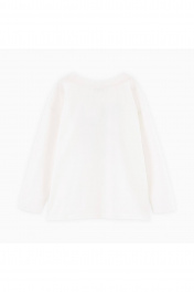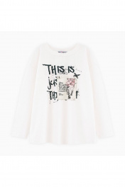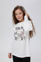 Лонгслив молочного оттенка для девочки. Модель прямого объёмного силуэта со спущенной линией плеча. Эластичная горловина из рибаны. Лонгслив декорирован дизайнерскими принтами и фразами.