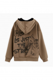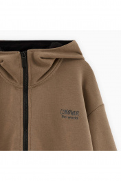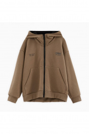 Зип-худи оттенка карамельный песок для мальчика. Модель прямого объёмного силуэта со спущенной линией плеча. Объёмный капюшон с контрастной подкладкой. Накладной карман-кенгуру. Комфортная застёжка на молнию. Акцентный авторский принт на спинке.