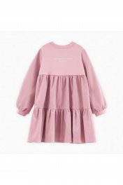 Ярусное платье с романтичными рукавами нежного розового оттенка. Модель комфортного А-образного силуэта. Воротник и рукава из рибаны. Изделие из тактильно приятного микровельвета. Декорировано дизайнерской DTF печатью на водных экологических красках.