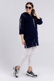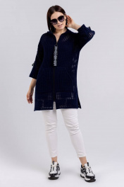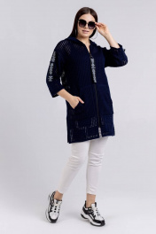 Жакет женский прямого силуэта, длиной до середины линии бёдер. Центральная застежка на тесьму-молнию. Деталь переда с накладными карманами. Рукава втачные, 7/8. Округлый вырез горловины обработан капюшоном. Декором служит декоративная тесьма на рукавах и привеска на тесьму-молнию.