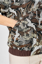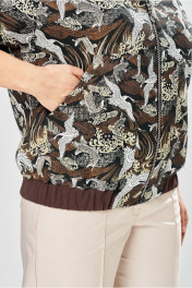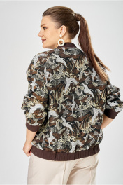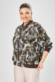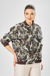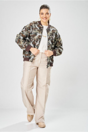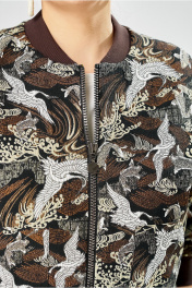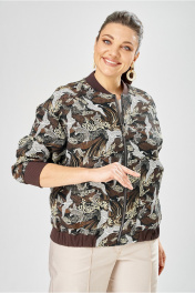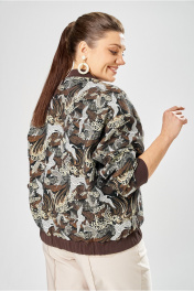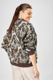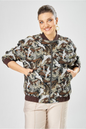 Стильный женский бомбер, свободного силуэта, выполнен из жаккардовой ткани с актуальным принтом. По переду накладные карманы, застежка на тесьму молнию по переду. Горловина круглая, оформлена довязом, рукава со спущенный проймой, низ рукавов, и низ бомбера с довязом. Изделие на подкладке. Длина бомбера – 63,5 см Длина рукава – 52 см.