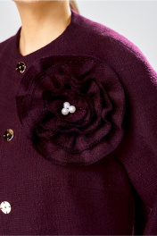 Стильный женский жакет, выполнен из жаккарда с большим содержанием хлопка. Жакет прямого силуэта, с центральной застежкой на пришивные кнопки Горловина с цельновыкроенной стойкой, рукав реглан. Низ рукава и низ изделия с вытрепанным краем. Жакет украшен декоративной розой из основной ткани. Жакет на подкладке. Длина жакета – 63 см Длина рукава от горловины – 77 см.