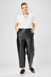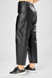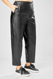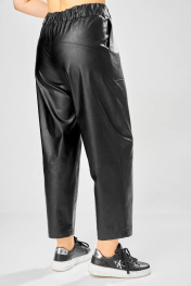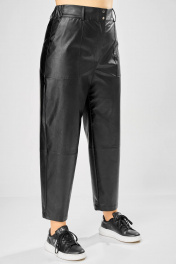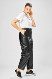 Длина брюк по боковому шву– 100 см Длина брюк по шаговому шву – 69 см Стильные женские брюки, из эко-кожи. Брюки, зауженные к низу, по передним половинкам накладные карманы, застежка по линии банта на молнию, на задних половинках отрезная кокетка и накладные карманы. Верх брюк на пояса с застежкой на кнопки.