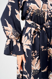 Платье женское. Элегантное женское платье из атласной ткани с крэш-эффектом. Платье полуприлегающего силуэта, отрезное по линии талии, по центру переда заложена широкая складка, горловина круглая. Рукава втачные, расширенные к низу, на расстоянии 14 см от низа рукава настрочена резанка, создавая эффект волана. Юбка расширена к низу, линия талии собрана на резинку. Платье с подкладкой только по юбке. В комплект входит сьемный пояс. Длина платье – 124 см Длина рукава – 58 см.