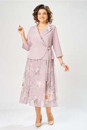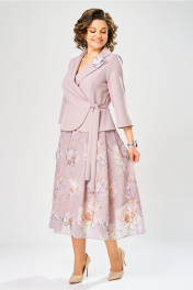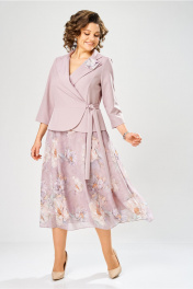 Элегантное женское платье, выполнено из двух видов ткани. Верх из плательной ткани, низ – сетка. Платье полуприлегающего силуэта, верх жакетного типа с запахом. Юбка расширенная со сборкой по талии, на подкладке. Платье украшено съемным цветком ручной работы.