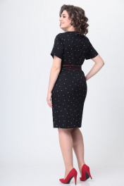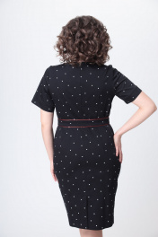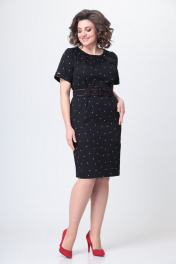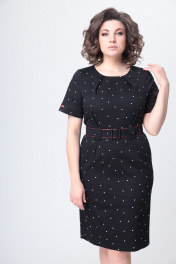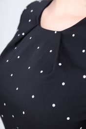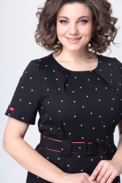 Элегантное женское платье выполнено из плотного эластичного хлопка. Платье полуприлегающего силуэта. По переду платье отрезное по линии талии, по лифу и юбке заложены складки и настрочены широкие шлевки. Горловина круглая. Спинка с центральным швом и застежкой на тесьму молния. Рукава втачные, короткие с притачной манжетой и ярким декоративным элементом. Платье со съемным поясом. Пояс с отделкой из яркого канта и пряжкой. Длина платья по спинке – 101 см Длина рукава – 49-50 см