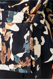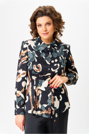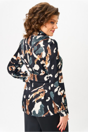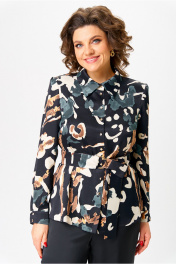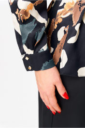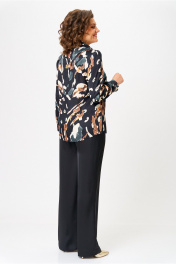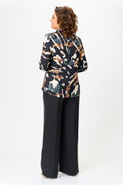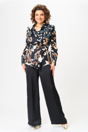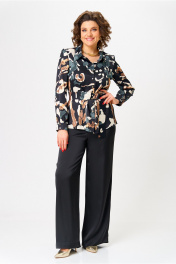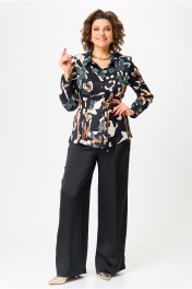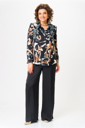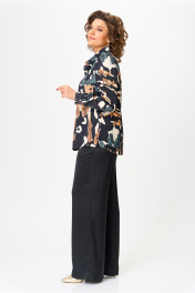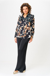 Элегантный женский костюм состоит из рубашки и брюк. Рубашка из атласа, полуприлегающего силуэта с центральной застежкой на декоративные пуговицы, воротник рубашечный со стойкой. Рукава втачные, по низу с манжетом, застежка на петли пуговицы. Брюки свободного силуэт, расширенные к низу, верх на поясе с резинкой. В комплект входит ремень из атласа с декоративной пряжкой. Длина рубашки – 69 см Длина рукава – 61 см Длина брюк – 112 см