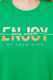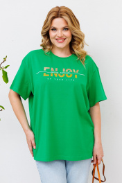 Базовая женская футболка. Крой футболки свободный, оверсайз.Вырез горловины круглый. Рукав до локтя. Линия плеча спущенная.Футболка выполнена из хлопкового трикотажного полотна.Трикотаж не просвечивается, не деформируется после стирки, легко гладится.По переду выполнена авторская печать в виде надписи “enjoy” переливающейся фольгой.Футболка универсальная, сочетается с любыми джинсами и шортами. Длина - 70 см