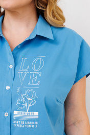 Платье - рубашка прямого кроя. Застежка по переду, на пуговицы. Имеется нагрудная вытачка. Рукав короткий цельнокроенный. В боковом шве расположен карман. По переду расположена печать серебрянной фольгой. Длина - 99 см