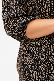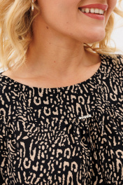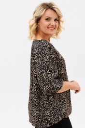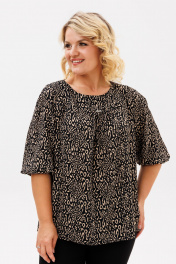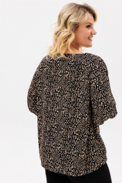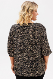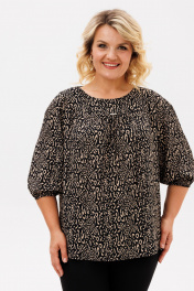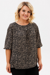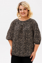 Блузка прямого силуэта, из шифоновой ткани принт леопард. Блузка с круглым вырезом горловины и широкой планкой на которой расположена, декоративные стразы, в блузке боковые швы переходят на деталь переда и заканчиваются разрезами, с не большим перепадом длины. Спинка на широкой обтачке. Рукава полуреглан, расширенные, низ на резинке, длина 3/4. С помощью блузки можно создавать интересные образы на каждый день.
