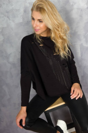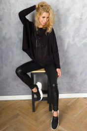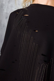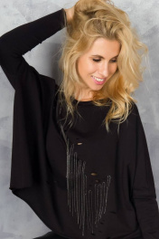 блузка оверсайз свободного кроя в стиле «гранж». Полочка блузки декорирована металлическими цепочками пришитыми вручную, которые эффектно разлетаются при движении. Также полочка украшена разрезами разного диаметра. Рукав одношовный полноценной длины. Линия плеча спущена. Низ изделия, низ рукава и край горловины с открытыми срезами. Блузка изготовлена из несыпучей, гипоаллергенной, деликатной и приятной для тела ткани - футер. Размерный ряд: 44-46, 48-50, 52-54 Рекомендации по уходу: стирать и утюжить с изнаночной стороны.