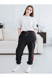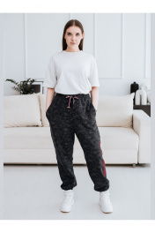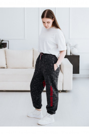 Комфортные женские брюки спортивного стиля. Изготовлены из плотного 3х-ниточного хлопкового футера без начеса, состав ткани 95% хлопок, 5% эластан, цвет серый с эффектом варки. Брюки с резинкой по талии и по низу, пояс с отделочной тесьмой и металлической фурнитурой высокого качества. Карманы в боковых швах. Декорированы текстовым флок-принтом (бархатистое покрытие), данный вид печати на ткани отлично стирается, не трескается, после нескольких лет активной носки выглядит как новый. Брюки универсальны и подходят как для повседневной носки, так и для спорта, активного отдыха. Стирать и утюжить с изнаночной стороны, стирка при 30С, бархатистый принт чистить липким роликом или скотчем при необходимости.