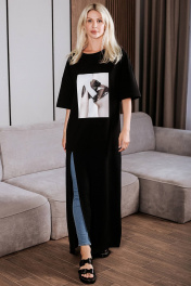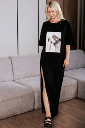 Женское платье-футболка макси. Силуэт прямой, свободный. Вырез горловины округлой формы. Линия плеча спущена. Платье с глубоким разрезом. Полочка платья декорирована принтом. Верх платья изготовлен из хлопковой гладкой трикотажной ткани 95% хлопок, 5% эластан, низ из жатой струящейся ткани 100% полиэстер.