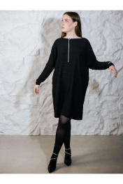 Платье-туника свободного кроя. Силуэт прямой, заужен к низу. Рукав длинный, отрезной, на базе цельнокроеного, летучая мышь. Ткань натуральная, тонкий трикотаж с фактурным абстрактным рисунком волна. Размер девушки 46 (93-69-98), рост 172, размер платья 46-48