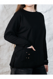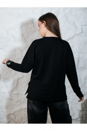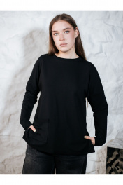 Женская блузка-лонгслив из натуральной хлопковой трикотажной ткани, ткань плотная, гладкая, тактильно приятная. Блузка с открытыми срезами, ткань не сыпется. Силуэт прямой, свободный, разрезы по боковым швам. Рукав длинный, отрезной, на базе цельнокроеного рукава. На девушке 46 (93-69-98) размера представлена блузка 44-46 размера.