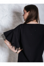 Очень красивое вечернее платье, представлено в больших размерах. Нарядное женское платье прямого силуэта, изготовлено из плотной, гладкой текстильной ткани. Платье украшено черными стразами с деликатным блеском. Рукава с мягкой линией плеча, с отделочной тканью еврофатин. Пояс в комплекте. Платье идет в размер, на модели представлено платье 46 размера, рост девушки 172, параметры 93-69-98.