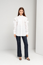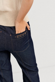 Брюки женские,длинные,прямые,на поясе,с вертикальными членениями по задним половинкам,накладными карманами фигурной формы сзади и прорезными карманами по переду.Застежка брюк на молнию и петлю с пуговицей по поясу.