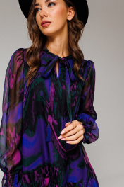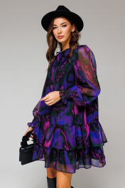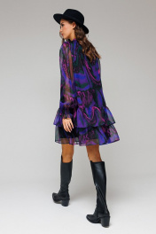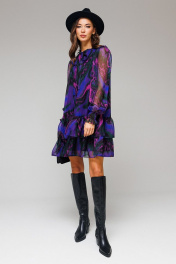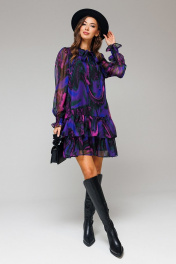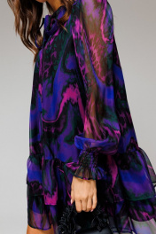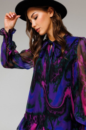 Платье А-силуэта. С втачным рукавом на резинках внизу. Полочка и спинка с притачными воланами по низу. Платье на подкладке. Воротник стойка, переходящий в завязку спереди. Горловина округлая с вырезом-каплей по переду.