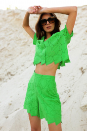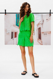 Комплект состоит из блузки и шорт. Блузка прямого силуэта с втачным коротким рукавом. Полочка с застежкой на пуговицы по цельнокроеной планке. Отложной воротник. Шорты прямого силуэта на притачном поясе. По переду и спинке - вытачки. В боковом шве потойная молния. Шорты на подкладке из тонкого хлопка.