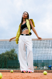 Брюки-палаццо на притачном поясе-резинке с декоративной нашивкой на нем. По переду со складками, с имитацией застежки-гульфика и карманами в боковых швах.
