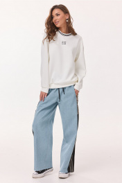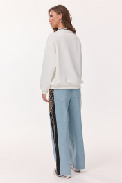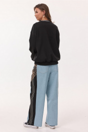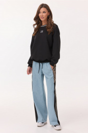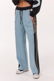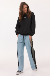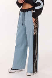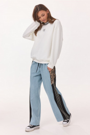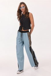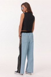 Брюки-джинсы, комбинированные, прямого силуэта. На притачном отстроченном поясе из трикотажного полотна с втянутым в него декоративным шнурком. Перед из спинка выполнены из джинса. По переду карманы в шве. По спинке накладные карманы. По бокам отрезной бочок, комбинированный из ткани с леопардовым принтом и трикотажной ткани, по которой отстрочено 3 узких лампаса.