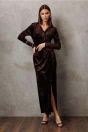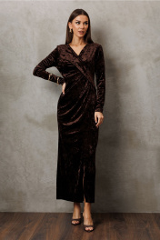 Платье велюровое прилегающего силуэта с втачным длинным одношовным рукавом. Перед платья на запах, вырез горловины V-образный и складки от запаха. Платье без подкладки.