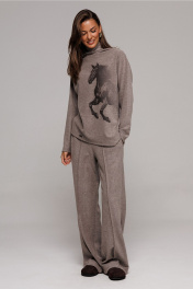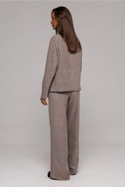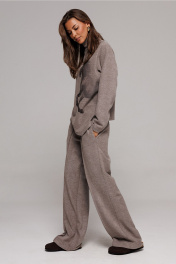 Брюки из трикотажного полотна с велюровым эффектом прямого силуэта на притачном, отстроченном поясе со вставленной в него резинкой. Полочка с защипами от пояса до низа брюк. Брюки с карманами в боковых швах.