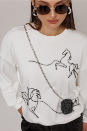 Джемпер из технологичного трикотажного полотна с эффектом peach. Прямого силуэта с втачным рукавом и спущенной линией плеча, с манжетой из отделочной ткани по низу рукава. По переду вышивка декоративным шнуром "Кони". По горловине и низу изделия притачная планка из отделочной ткани.