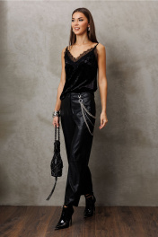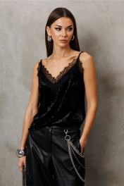 Топ из велюра с кружевом на регулируемых бретелях. Топ полуприлегающего силуэта, верху на широкой обтачке. Полочка с V-образным вырезом и кружевом по вырезу и нагрудной вытачкой.