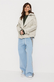 Куртка-тренчкот прямого силуэта с двубортной застежкой на петли-пуговицы, двухшовным рукавом и спущенной линией плеча, по низу рукавов паты с пряжкой. По полочке рукав втачной по спинке-реглан. Воротник пиджачного типа - отложной с лацканом. Полочка с карманом-листочкой. Спинка со средним швом и рельефом. По плечевому шву погон с застежкой на петли-пуговицы с щлеками. По низу притачная отстроченная планка со вставленной в нее резинкой. Куртка на подкладке.