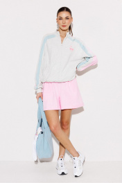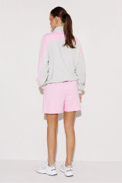 Джемпер мультиколор трикотажный (2-хнитка) прямого силуэта. По полочке рукав-реглан, по спинке-втачной. Рукав с лампасами из ткани другого цвета с манжетой по низу рукава. Полочка с центральной застежкой на тесьму-молнию, карманом-листочкой и печатью "Cherry". По переду рукав переходит в кокетку. По спинке один из лампасов переходит в кокетку. По горловине воротник-стойка. По низу изделия притачная планка.
