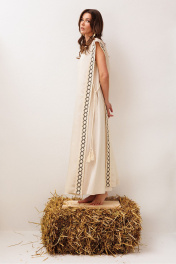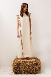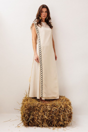 Платье длинное, состоящие их верхнего и нижнего. Верхнее платье из полупрозрачной ткани, слегка расклешенное к низу без рукавов. По бокам платье не стачено с завязкой на декоративный шнурок. По всей длине полочки и спинки по бокам настрочено кружево. Горловина округлая с притаченым к ней кружевом. По спинке вырез капля с застежкой на навесную петлю-пуговицу. Нижнее платье А-силуэта без рукавов, с карманами в боковых швах. Вырез горловины – округлый.
