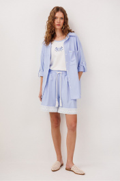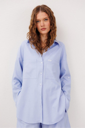 Блузка прямого силуэта, с втачным одношовным рукавом с патой, внизу со складкой и манжетой с застежкой на петлю-пуговицу. Полочка с центральной застежкой по планке на петли-пуговицы. По переду настрочены карманы и с нашивкой на левом кармане. По спинке кокетка и встречная складка от кокетки. Воротник рубашечный отложной на стойке. Спинка и полочка с фигурным низом. Внизу по боковым швам обработаны разрезы.