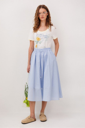 Юбка А-образного силуэта, на притачном отстроченном поясе на резинке и вставленным в него шнурком из основной ткани с наконечниками. Юбка на подкладке из основной ткани и карманами в боковом шве.