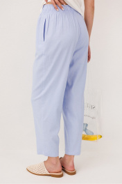 Брюки зауженные к низу на притачном отстроченном поясе. По переду имитация гульфика и карманом-листочкой от бокового шва.