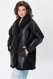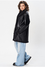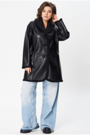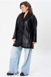 Куртка свободного кроя, с V-образным вырезом и отложным двухсторонним воротником шаль. Спинка разрезная по среднему шву, чуть ниже линии талии подрез, на полочке обработаны карманы в рельефе, полочка с рельефом по линии груди. Рукав, полуреглан фигурный моделированный, застежка центральная на петли пуговицы. Длина изделия по среднему шву спинки 85 см, длина рукава без учёта подреза полуреглан 59 см, длина рукава с учётом подреза от угла плеча 76 см, Изделие выполнено из мягкой и легкой экокожи. Куртка без подкладки и утеплителя, изнанка - экомех. По температурному режиму подходит для еврозимы (до -5), осени и весны (демисезон). Примечание: Перед первой примеркой рекомендуется пройти изнанку (мех) изделия липким роликом для чистки одежды.