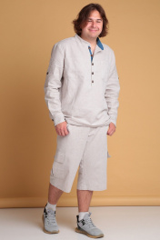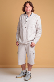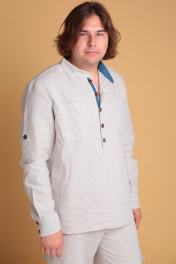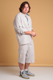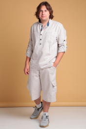 Мужская льняная рубашка от Celentano свободного силуэта. Воротник-стойка, внутренняя часть которой с контрастной отделкой. Застежка на петли и пуговицы, расположенные на планке. На полочке карманы. Спинка рубашки с двойной кокеткой и шлевкой. Внутренняя часть кокетки и шлевка выполнены из контрастной ткани. Рукав одношовный втачной, заканчивается манжетой с застежкой на две петли и пуговицы. Внутренняя часть манжеты контрастная. На рукавах выполнены паты для укорачивания. Длина изделия по спинке 76 см., длина рукава 67 см. Рубашка выполнена из качественного белорусского льняного полотна (пр-во Орша). Ткань не тянется. Все пуговицы натуральные кокосовые. Наша рубашка из натурального льна будет незаменима для повседневного использования прохладным летом или вечером. На фото рубашка с нашими шортами 3020. Также оба изделия можно приобрести костюмом 3029 или скомпоновать ее с брюками 3021.