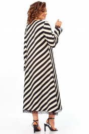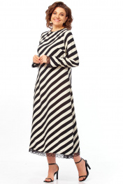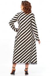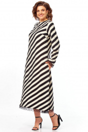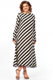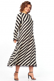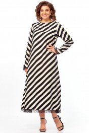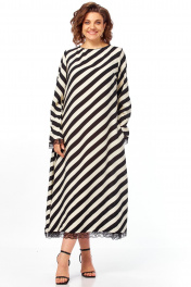 Модель представлена в свободном А-силуэте (трапеция), который обеспечивает комфортную посадку и свободу движений. Главным визуальным акцентом является контрастный принт в виде широких диагональных полос. Такое направление рисунка обладает выраженным оптическим эффектом: оно визуально вытягивает силуэт, придает динамику образу и делает фигуру стройнее. Низ подола и манжеты рукавов декорированы широким черным кружевом, этот элемент добавляет модели нарядности и смягчает строгость геометрического принта. • Горловина: Классический круглый вырез, лаконично оформленный, что подчеркивает линию шеи. • Рукава: Втачные, полной длины (62см без учета кружева). Свободный крой рукава заканчивается изящным кружевным акцентом на запястьях. • Карманы: В боковых швах предусмотрены функциональные потайные карманы, которые не нарушают общую линию кроя. • Длина: Актуальная длина миди (125см без учета кружева), которая гармонично сочетается с классической обувью на каблуке.