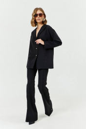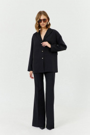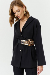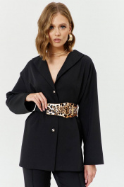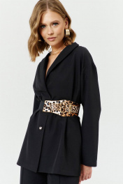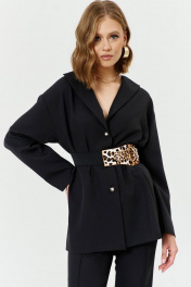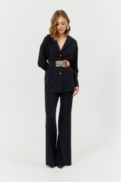 Костюм женский, состоящий из блузы и брюк. Блуза прямого силуэта с центральной бортовой застежкой на 3 прорезные петли и пуговицы. Перед с нагрудными вытачками. Спинка без конструктивных элементов. Рукава рубашечного типа одношовные, длинные. Вырез горловины V-образный с отложными лацканами. В комплекте – пояс из основного материала. Брюки клеш с застежкой на тесьму молнию с гульфиком и откоском; с притачным поясом со шлевками. Передние половинки брюк с боковыми карманами и отстроченными кантами. Задние половинки брюк с талиевыми вытачками. Пояс с пряжкой с принтом – «леопард» и резинкой.