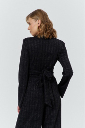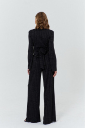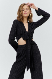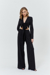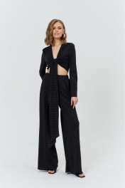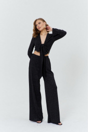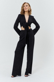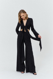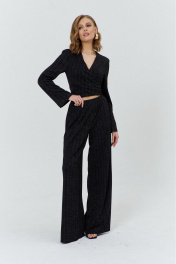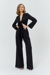 Костюм женский, состоящий из блузы и брюк, выполнен из трикотажа. Блуза прилегающего силуэта. Перед с длинными завязками, предназначенными для фиксирования блузы на запах. Спинка с талиевыми вытачками. Рукава втачные одношовные длинные. Блузка с плечевыми накладками. Брюки - палаццо, с притачным поясом, на резинке. Передние половинки брюк с боковыми карманами.Задние половинки брюк без конструктивных элементов.