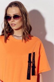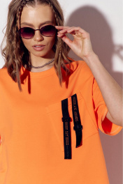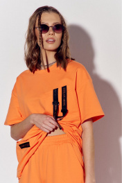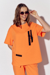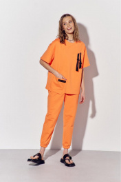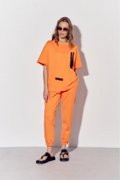 Костюм женский, состоящий из брюк майки, выполнен из трикотажного полотна. Майка прямого силуэта. Перед с накладными карманами. На верхнем кармане расположена декоративная тесьма, протянутая сквозь пластиковые пряжки. На нижнем кармане настрочена декоративная тесьма. Вырез горловины округлый, обработан планкой. Рукава втачные, одношовные, короткие. Брюки с поясом на резинке. На передних половинках брюк обработаны боковые карманы. Низ брюк на резинке.