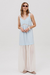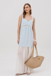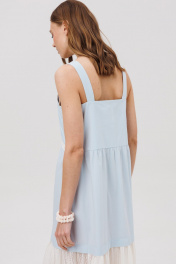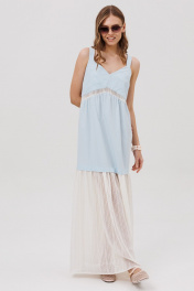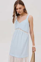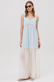 Платье силуэта- трапеция, на бретелях. Перед состоит из деталей лифа со складками, с отрезной деталью со сборкой и притачной ажурной деталью со сборкой. Спинка состоит из лифа, притачной детали со сборкой и притачной нижней ажурной детали со сборкой.