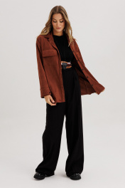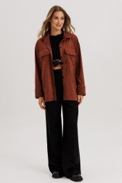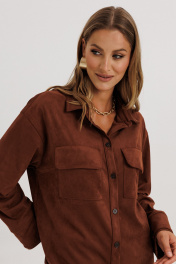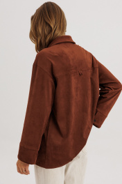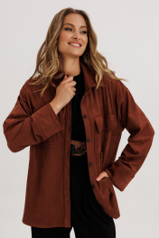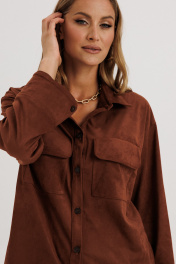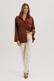 Рубашка женская прямого силуэта, с центральной застежкой с планками, застегивающимися на 6 прорезных петель и пуговиц. Рубашка выполнена из искусственной замши.Перед с нагрудными вытачками, с накладными карманами с клапанами.Спинка с отрезной кокеткой, посередине которой вставлена петелька.Рукава рубашечного типа с притачными по низу манжетами с отделочными клапанами. Воротник стояче-отложной с отрезной стойкой, застегивающейся на 1 прорезную петлю и пуговицу.