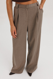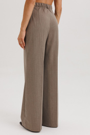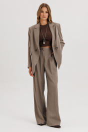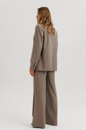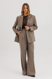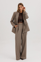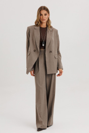 Костюм женский, состоящий из жакета и брюк. Жакет прямого силуэта с двубортной застежкой на 2 петли и пуговицы. Полочки - с прорезными карманами с клапаном и 2-мя обтачками, с нагрудными вытачками от кармана вверх. Низ переда асимметричный. Правая полочка удлинена к борту. Спинка со средним швом и рельефами от низа до проймы. Воротник пиджачного типа с отложными лацканами. Рукава длинные втачные 2-хшовные, с передним и локтевым швами. В нижней части локтевого шва обработана закрытая шлица с 4-мя пуговицами. Жакет на подкладке и с плечевыми накладками. Брюки - палаццо с застежкой с гульфиком и откоском на тесьму-молнию; с притачным поясом с резинкой по спинке. Пояс со шлевками (2 широкие -по переду и 3 узких по спинке). Пояс застегивается на потайной крючок. Передние половинки брюк со складками и боковыми карманами. Задние половинки брюк с талиевыми вытачками.