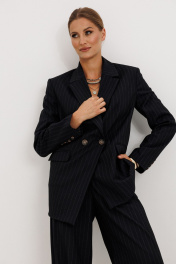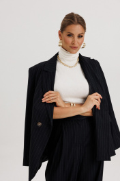 Костюм женский, состоящий из жакета и брюк. Жакет прямого силуэта с двубортной застежкой на 2 петли и пуговицы. Полочки - с прорезными карманами с клапаном и 2-мя обтачками, с нагрудными вытачками от кармана вверх. Низ переда асимметричный. Правая полочка удлинена к борту. Спинка со средним швом и рельефами от низа до проймы. Воротник пиджачного типа с отложными лацканами. Рукава длинные втачные 2-хшовные, с передним и локтевым швами. В нижней части локтевого шва обработана закрытая шлица с 4-мя пуговицами. Жакет на подкладке и с плечевыми накладками. Брюки - палаццо с застежкой с гульфиком и откоском на тесьму-молнию; с притачным поясом с резинкой по спинке. Пояс со шлевками (2 широкие -по переду и 3 узких по спинке). Пояс застегивается на потайной крючок. Передние половинки брюк со складками и боковыми карманами. Задние половинки брюк с талиевыми вытачками.