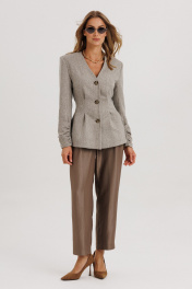 Брюки женские слегка зауженные книзу, с притачным поясом со шлевками, с застежкой на тесьму-молнию с гульфиком и откоском. Пояс застегивается на одну прорезную петлю и пуговицу. Передняя половинка брюк с 2-мя складками, застроченными сверху, с боковыми карманами. На задней половинке брюк – 2 талиевых вытачки.