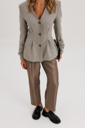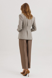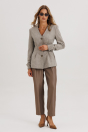 Жакет прилегающего силуэта с центральной бортовой застежкой на 3 прорезных петли и пуговицы.Перед со складкой застроченной на уровне талии, с бочком. В шве притачивания бочка обработан карман “ в швах”.Спинка со складками ,застроченными на уровне линии талии. Рукава втачные двухшовные длинные с накладной деталью со сборкой внизу верхней части рукава. Вырез горловины V-образный. Жакет на подкладке и с плечевыми накладками.