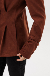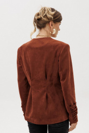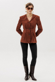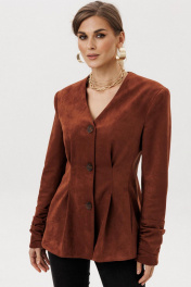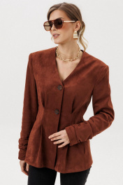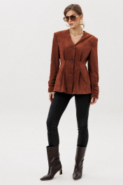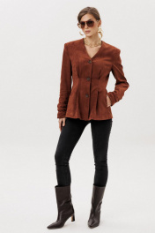 Жакет прилегающего силуэта с центральной бортовой застежкой на 3 прорезных петли и пуговицы. Жакет выполнен из искусственной замши. Перед со складкой застроченной на уровне талии, с бочком. В шве притачивания бочка обработан карман “ в швах”. Спинка со складками ,застроченными на уровне линии талии. Рукава втачные двухшовные длинные с накладной деталью со сборкой внизу верхней части рукава. Вырез горловины V-образный. Жакет на подкладке и с плечевыми накладками.